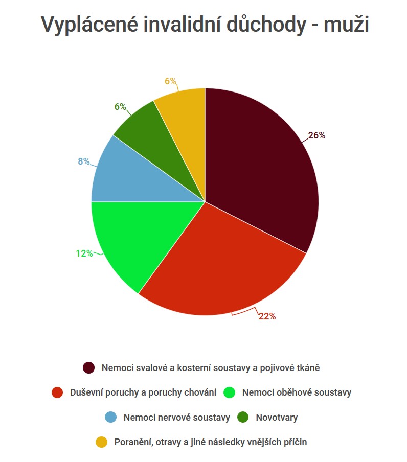 Muže nejvíce postihují nemoci svalové a kosterní soustavy a pojivové tkáně, následně pak duševní poruchy a poruchy chování a nemoci oběhové soustavy.